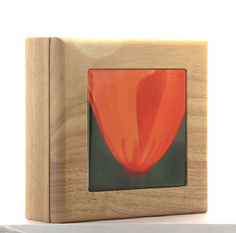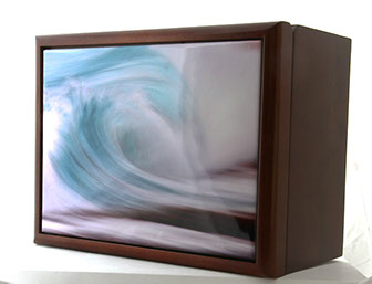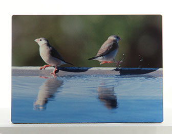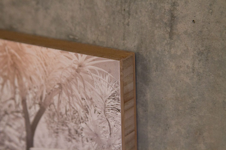 Aluminum as a printing surface is a sleek modern look with a dynamic sheen that changes as you move past the piece. We can print on aluminum up to 4 feet by 8 feet. Aluminum can be float framed (frame is a hidden box in the center of the piece) or box framed (frame sides go straight back from the edge) or it can be unframed and screwed directly to a wall (or ceiling). The ink is fused to the metal, and then covered with a clear coat. It is scratch resistant (though not impervious) and it can be cleaned with a microfiber cloth.